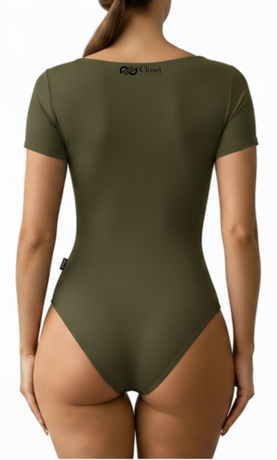 Body Poliamida Decote Quadrado Manga Curta Verde Militar